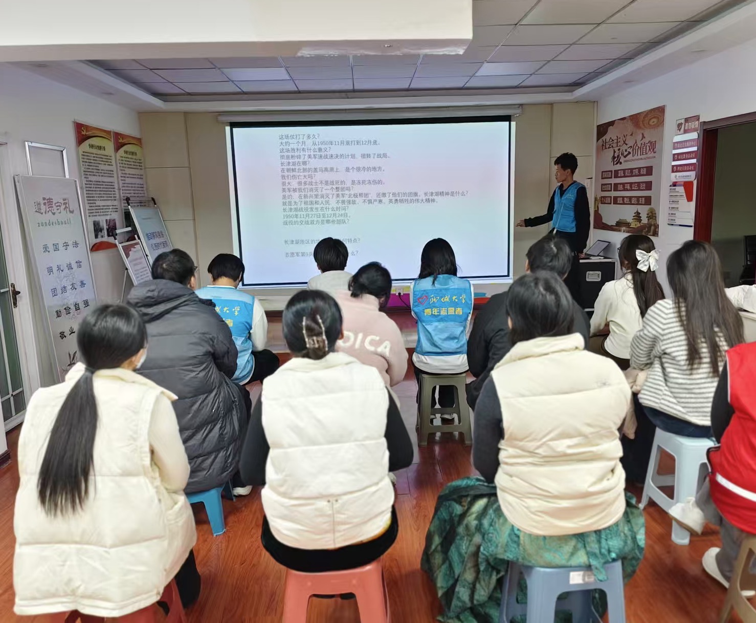 活动围绕“观影、讲解、互动”三大环节展开。在观影阶段,志愿者们播放长津湖战役历史纪实影像片段,生动再现志愿军战士英勇顽强、不畏牺牲的战斗场景,吸引众多社区居民驻足观看,迅速点燃活动氛围。随后,志愿者结合图文资料,深入浅出讲解战役背景、英雄事迹与长津湖精神深刻内涵,带领居民追忆峥嵘岁月,感悟先烈们舍生取义、保家卫国的赤诚初心。现场互动问答环节中,志愿者们围绕长津湖战役相关知识展开有奖竞答,居民们踊跃参与、积极作答,在趣味互动里深化对红色历史的认知与感悟。活动尾声,志愿者为居民发放主题宣传资料,让红色精神浸润人心、融入日常,不少居民表示,此次活动填补了自身长津湖战役知识空白,今后将深入学习了解红色文化。
