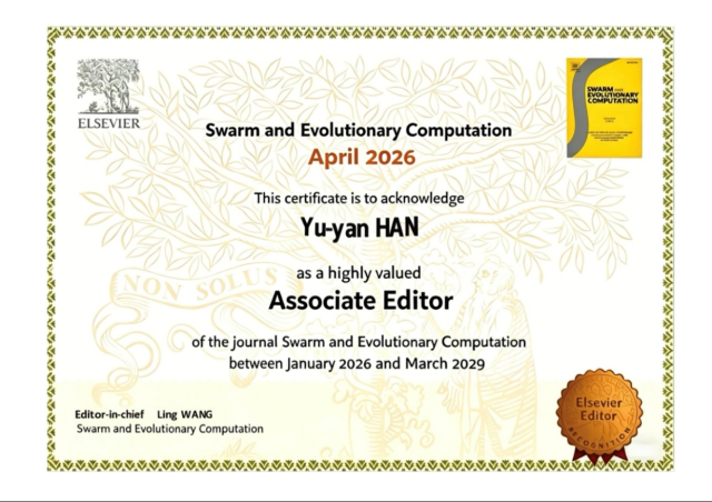 近日,我院韩玉艳副教授当选国际知名学术期刊《群体与进化计算》(Swarm and Evolutionary Computation, SWEVO)副主编(Associate Editor)。此次当选既是国际学术界对韩玉艳个人学术能力的高度认可,也是我院在群体智能与进化计算领域学科建设成效的重要体现,将进一步提升我院相关学科的国际影响力。