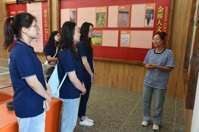 随后,实践队员与黄元桃进行座谈交流。队员们结合所见所感踊跃提问,黄元桃就农旅融合运营、研学资源开发等实际问题作了细致解答,并详细介绍了金桥村学习运用“千万工程”经验的具体做法。她特别谈到,脱贫攻坚期间,全村党员干部群众不忘初心、牢记使命,坚持以“党旗红”引领“乡村兴”,通过传承红色基因、讲好遵义故事、弘扬长征精神,不断巩固农村文化根基,绘就出一幅乡风淳朴、乡村美丽、百姓富裕的金桥新画卷。队员们深切体会到基层党员干部带领群众脱贫致富的奉献精神,直观感受到国家乡村振兴政策的实践力量,不仅进一步厚植了家国情怀,也更加坚定了以专业知识服务基层、助力乡村振兴的理想信念。