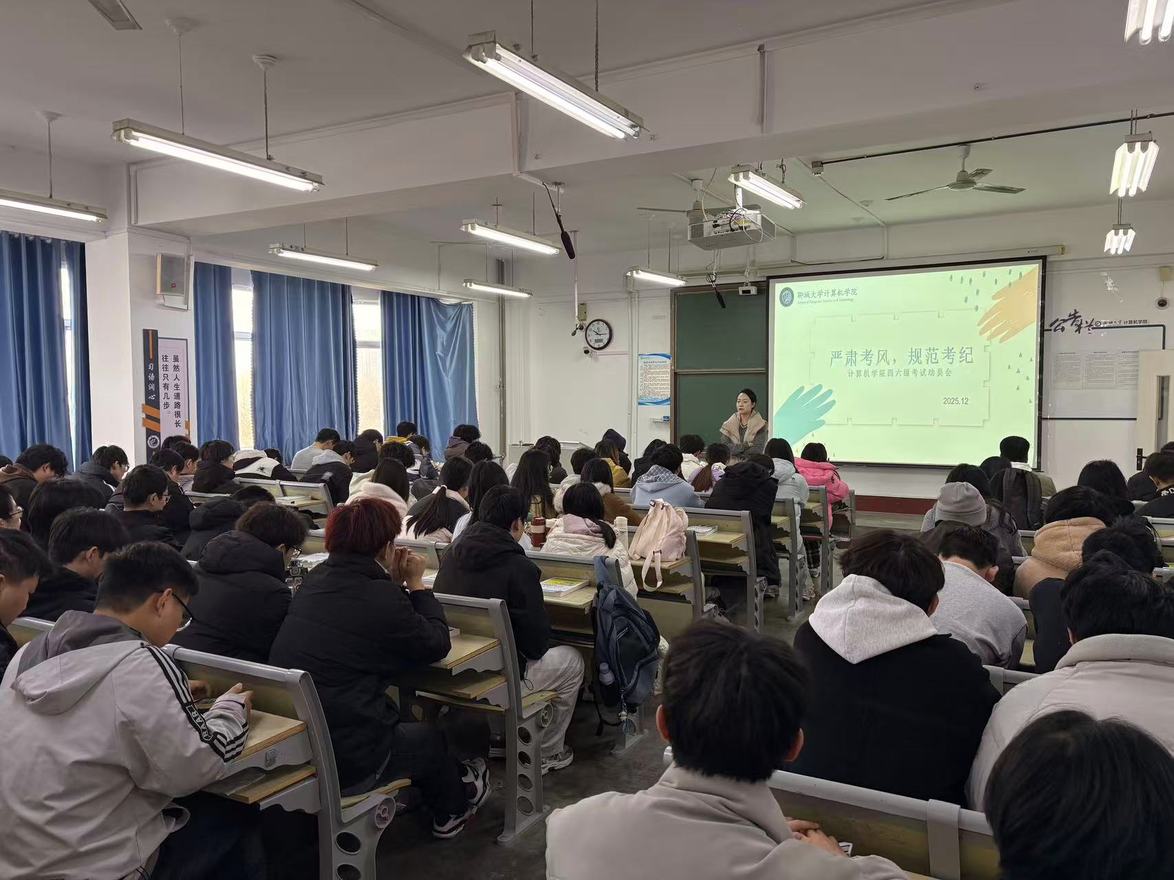 为进一步强化学风建设,营造公平公正、严肃规范的考试氛围,近日,计算机学院组织召开2025年下半年大学生英语四六级考试考风考纪主题班会。班会由大二、大三、大四各班班主任主持,全体考生参会。